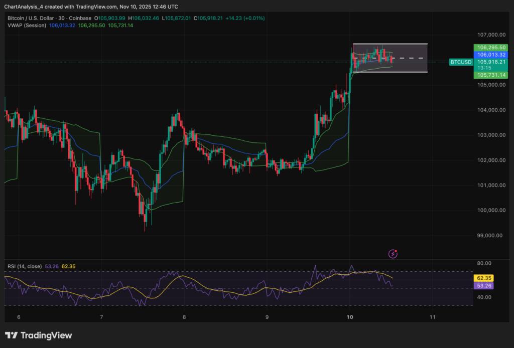 Intraday charts show Bitcoin moving in a tight range between $105,700 and $106,300, consolidating after a short-term bounce.