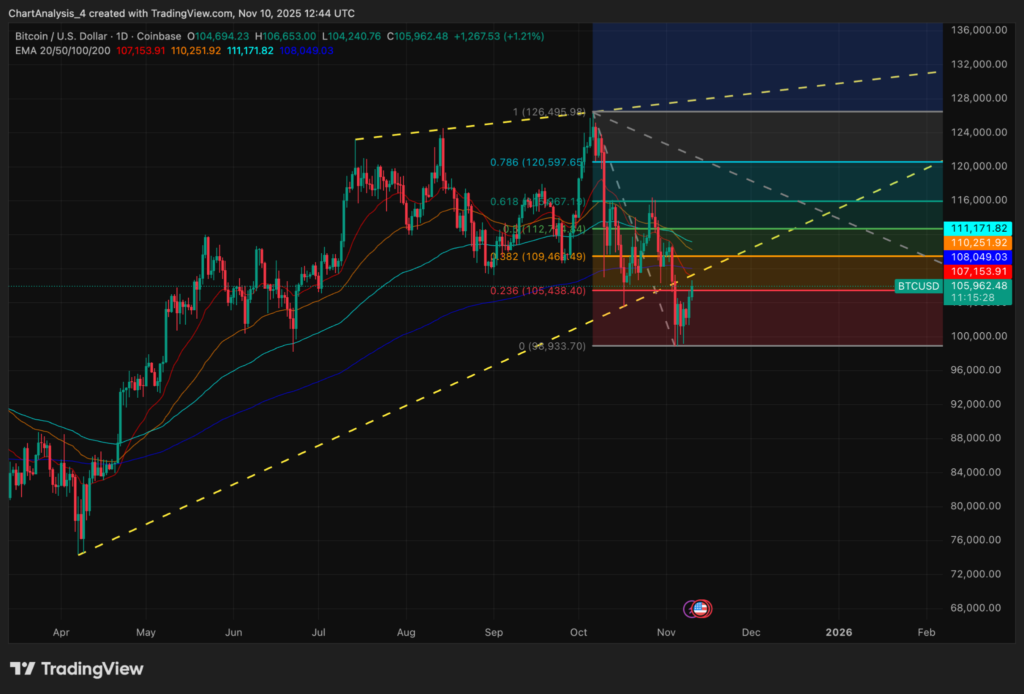 A decisive move above $109,450, near the 0.382 retracement, would signal the first meaningful bullish reversal since the selloff began.