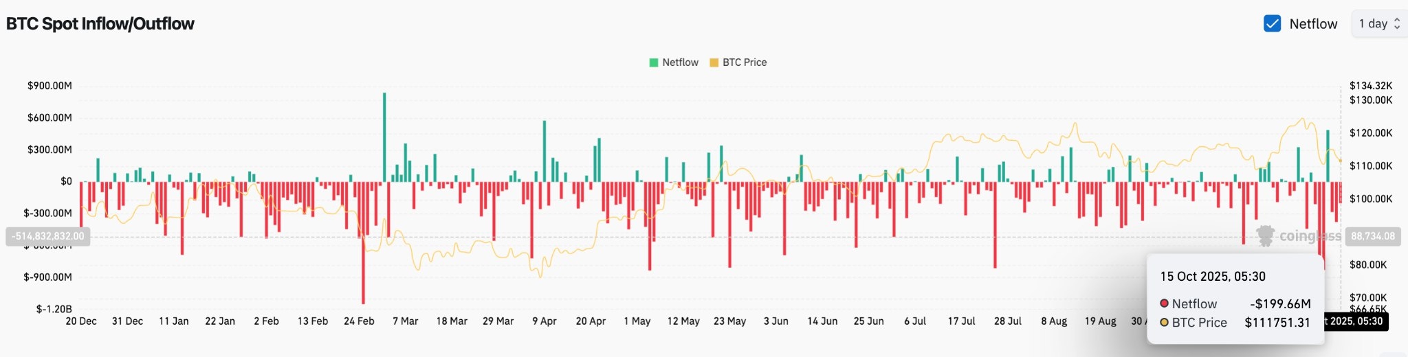 On-chain data from Coinglass shows over $800 million in BTC outflows across the past three sessions, a sign of ongoing distribution.